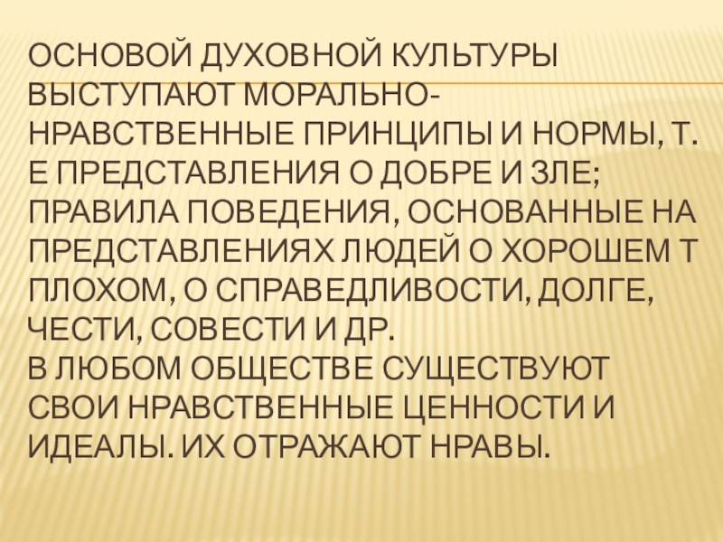 Под духовными ценностями подразумевают моральные нормы и нравственные идеалы, традиции, обычаи, религиозные нормы, произведения живописи, музыки, литературы и других видов искусства, а также научные знания и теории.
