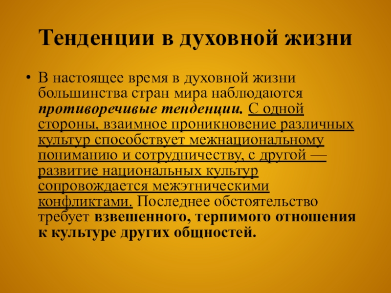 мира наблюдаются противоречивые тенденции. С одной стороны, взаимное проникновение различных культур способствует межнациональному пониманию и сотрудничеству, с другой — развитие национальных культур сопровождается межэтническими конфликтами. Последнее обстоятельство требует взвешенного, терпимого отношения к культуре других общностей.
