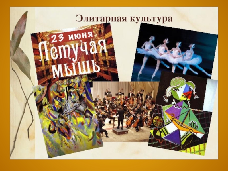 Слайд 35К элитарной культуре можно отнести авангардные направления в музыке, живописи, кинематографе,