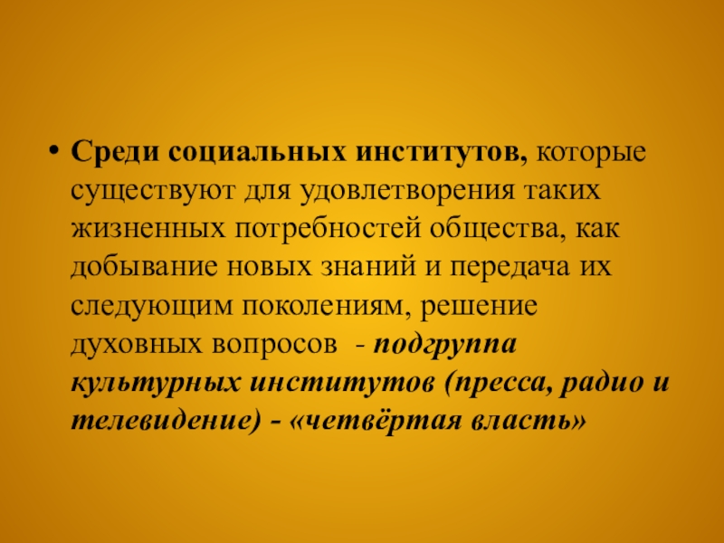 как добывание новых знаний и передача их следующим поколениям, решение духовных вопросов - подгруппа культурных институтов (пресса, радио и телевидение) - «четвёртая власть»