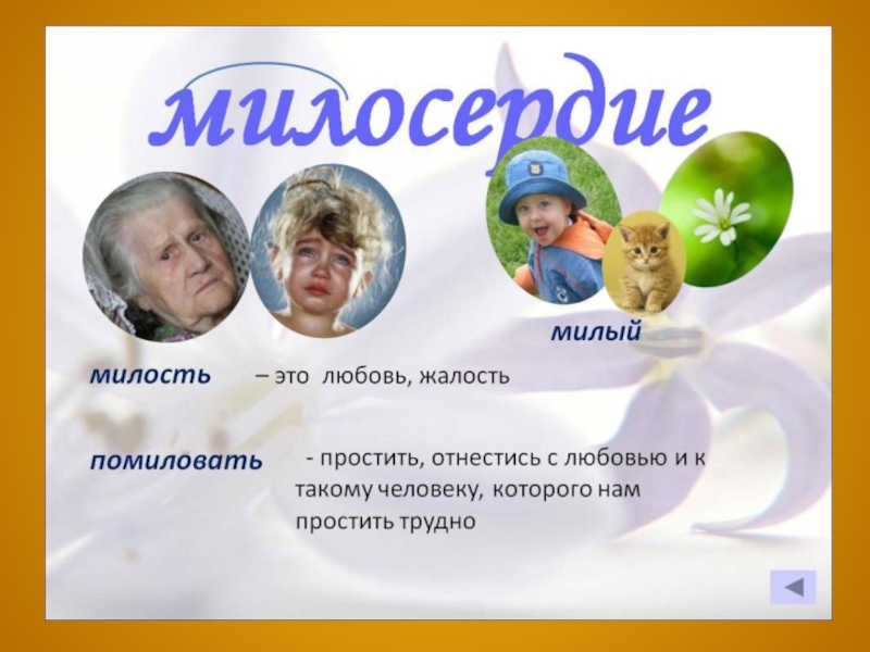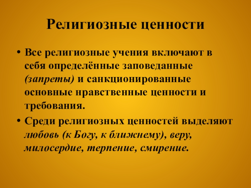 Среди религиозных ценностей выделяют любовь (к Богу, к ближнему), веру, милосердие, терпение, смирение.