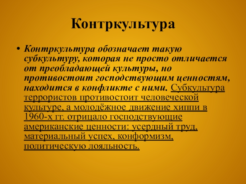 но противостоит господствующим ценностям, находится в конфликте с ними. Субкультура террористов противостоит человеческой культуре, а молодёжное движение хиппи в 1960-х гг. отрицало господствующие американские ценности: усердный труд, материальный успех, конформизм, политическую лояльность.