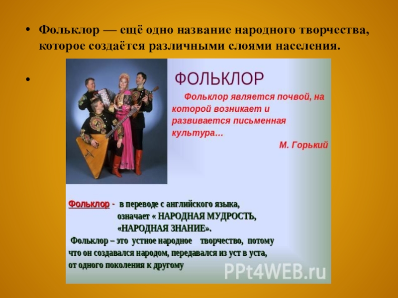 Слайд 33Фольклор — ещё одно название народного творчества, которое создаётся различными слоями