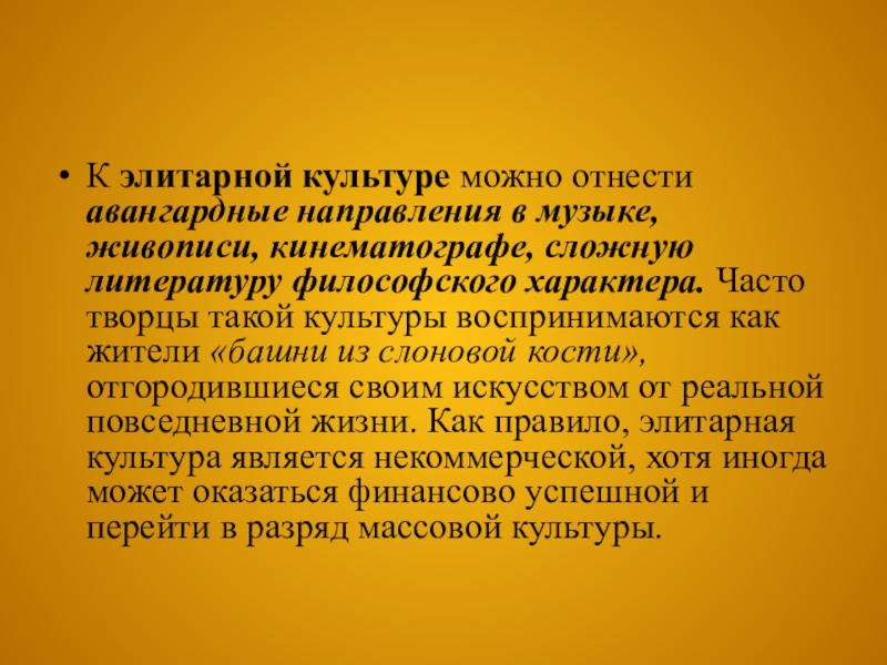 сложную литературу философского характера. Часто творцы такой культуры воспринимаются как жители «башни из слоновой кости», отгородившиеся своим искусством от реальной повседневной жизни. Как правило, элитарная культура является некоммерческой, хотя иногда может оказаться финансово успешной и перейти в разряд массовой культуры.
