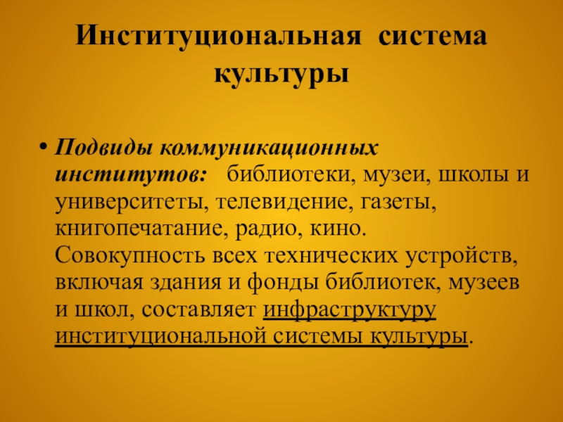 телевидение, газеты, книгопечатание, радио, кино. Совокупность всех технических устройств, включая здания и фонды библиотек, музеев и школ, составляет инфраструктуру институциональной системы культуры.