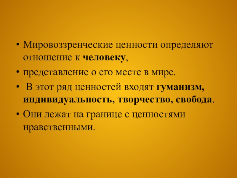 Слайд 11Мировоззренческие ценности определяют отношение к человеку,