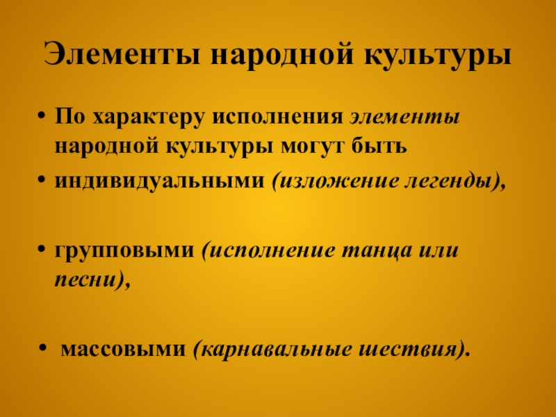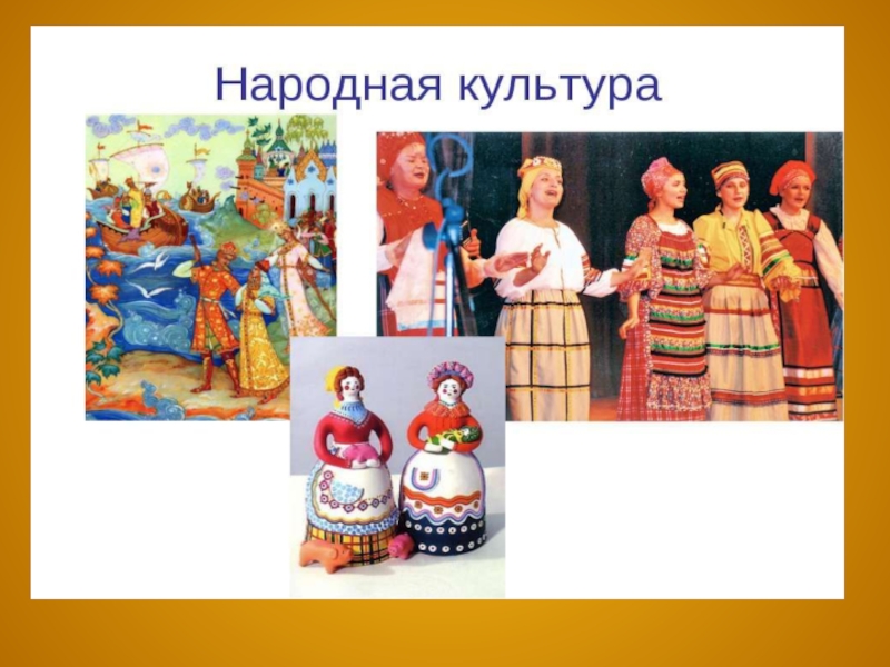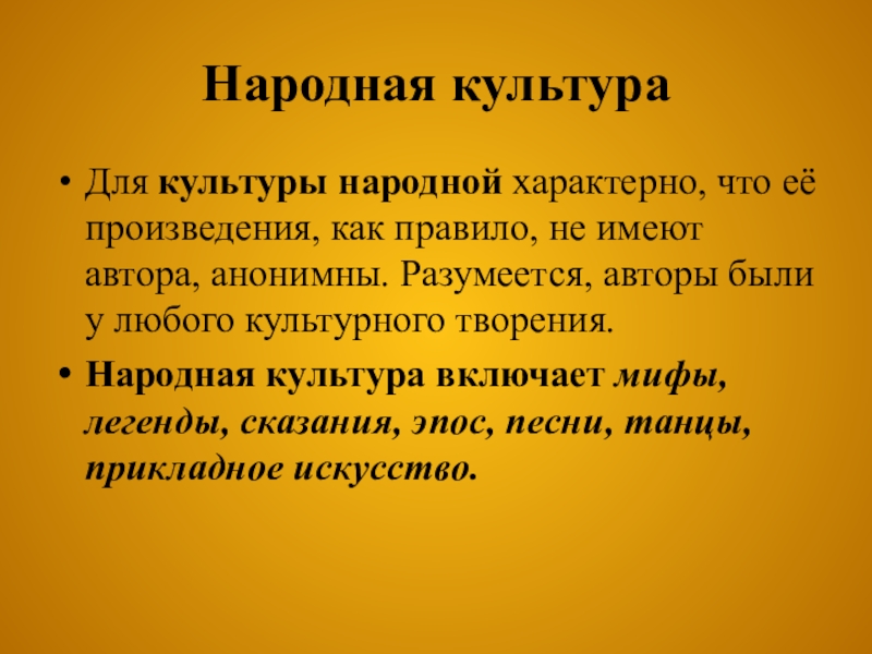 Народная культура включает мифы, легенды, сказания, эпос, песни, танцы, прикладное искусство.