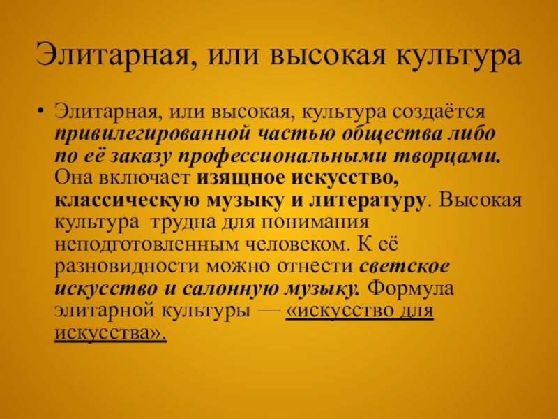 общества либо по её заказу профессиональными творцами. Она включает изящное искусство, классическую музыку и литературу. Высокая культура трудна для понимания неподготовленным человеком. К её разновидности можно отнести светское искусство и салонную музыку. Формула элитарной культуры — «искусство для искусства».