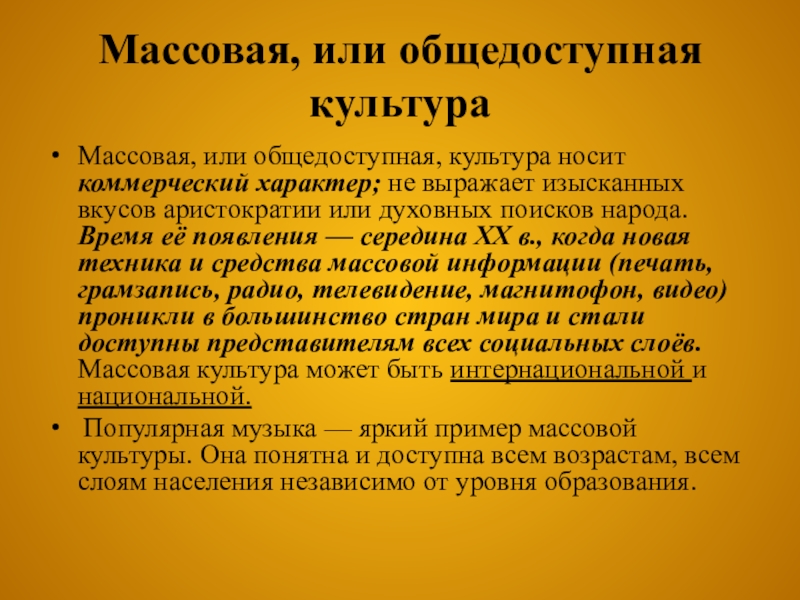 не выражает изысканных вкусов аристократии или духовных поисков народа. Время её появления — середина XX в., когда новая техника и средства массовой информации (печать, грамзапись, радио, телевидение, магнитофон, видео) проникли в большинство стран мира и стали доступны представителям всех социальных слоёв. Массовая культура может быть интернациональной и национальной.