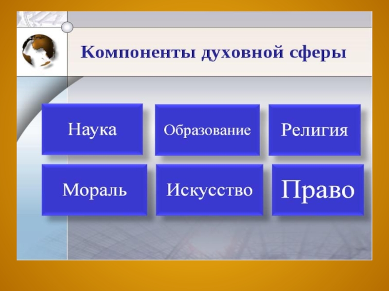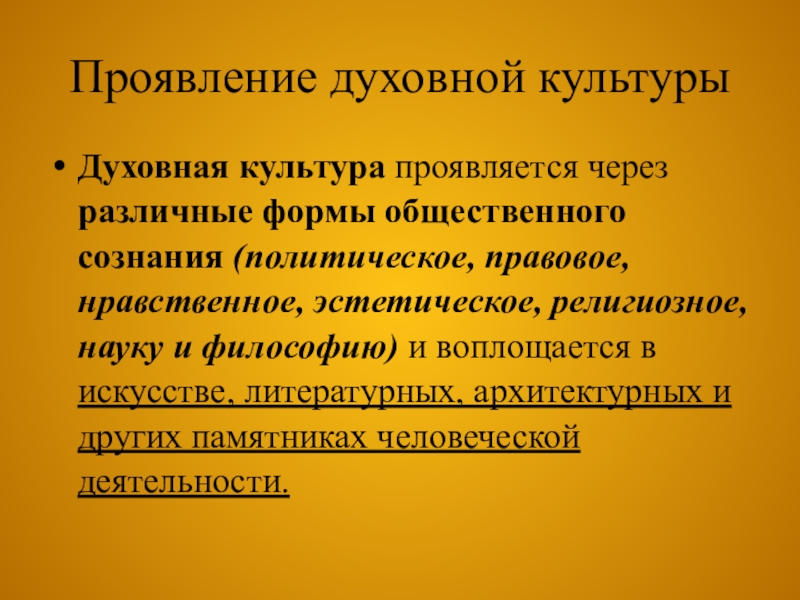 правовое, нравственное, эстетическое, религиозное, науку и философию) и воплощается в искусстве, литературных, архитектурных и других памятниках человеческой деятельности.