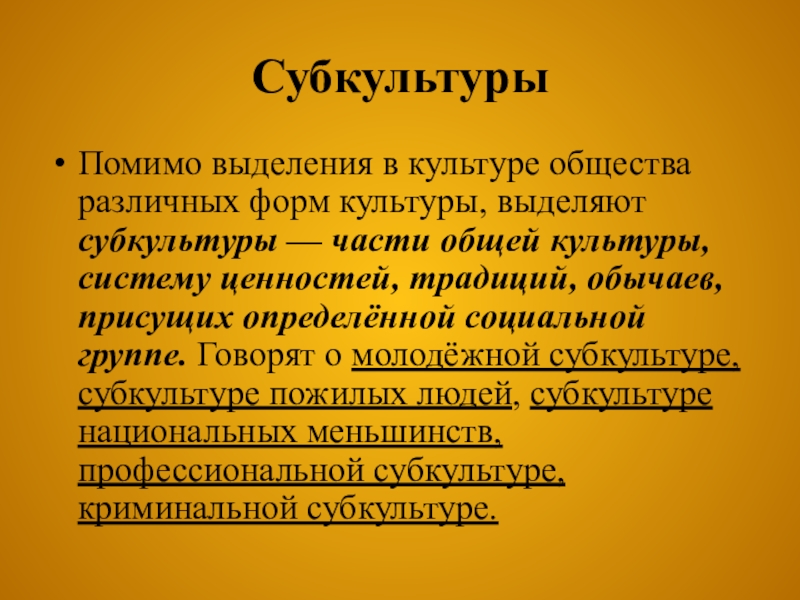 части общей культуры, систему ценностей, традиций, обычаев, присущих определённой социальной группе. Говорят о молодёжной субкультуре, субкультуре пожилых людей, субкультуре национальных меньшинств, профессиональной субкультуре, криминальной субкультуре.