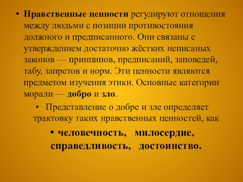 предписанного. Они связаны с утверждением достаточно жёстких неписаных законов — принципов, предписаний, заповедей, табу, запретов и норм. Эти ценности являются предметом изучения этики. Основные категории морали — добро и зло.