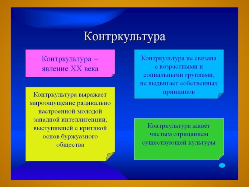 Контркультура обозначает такую субкультуру, которая не просто отличается от преобладающей культуры,