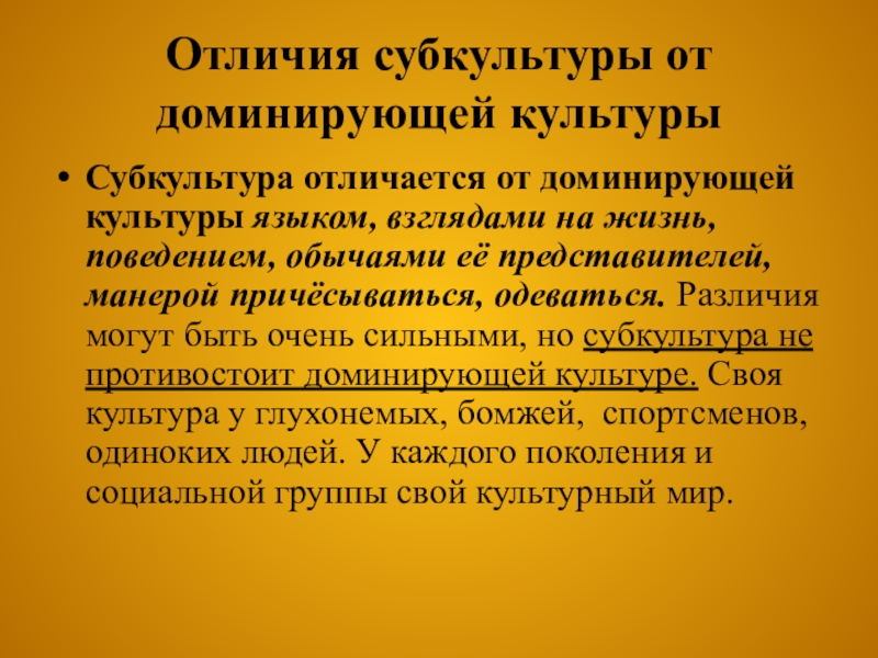 на жизнь, поведением, обычаями её представителей, манерой причёсываться, одеваться. Различия могут быть очень сильными, но субкультура не противостоит доминирующей культуре. Своя культура у глухонемых, бомжей, спортсменов, одиноких людей. У каждого поколения и социальной группы свой культурный мир.