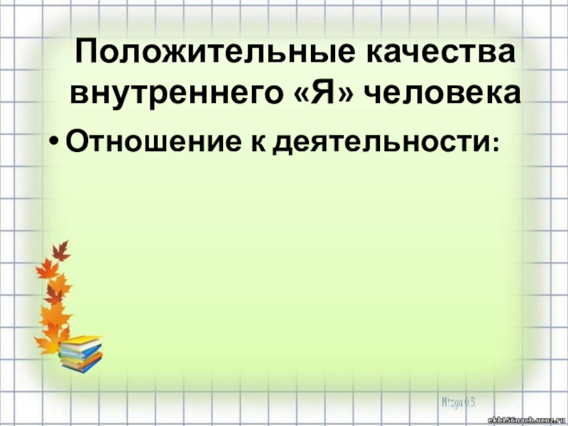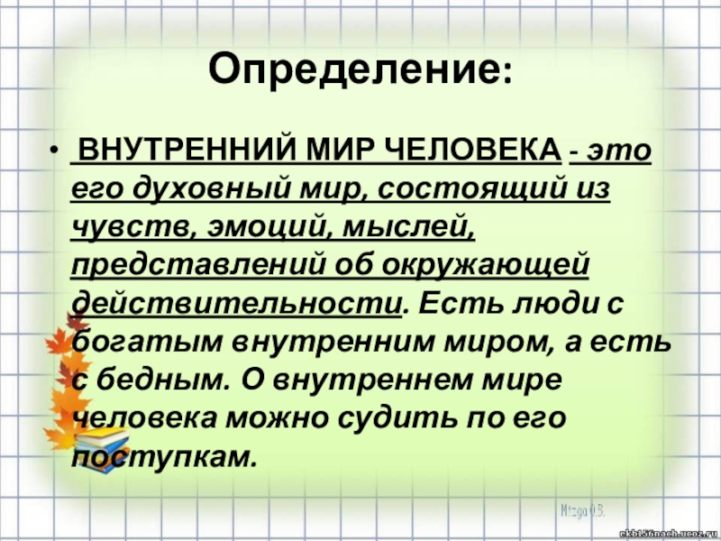 мыслей, представлений об окружающей действительности. Есть люди с богатым внутренним миром, а есть с бедным. О внутреннем мире человека можно судить по его поступкам.