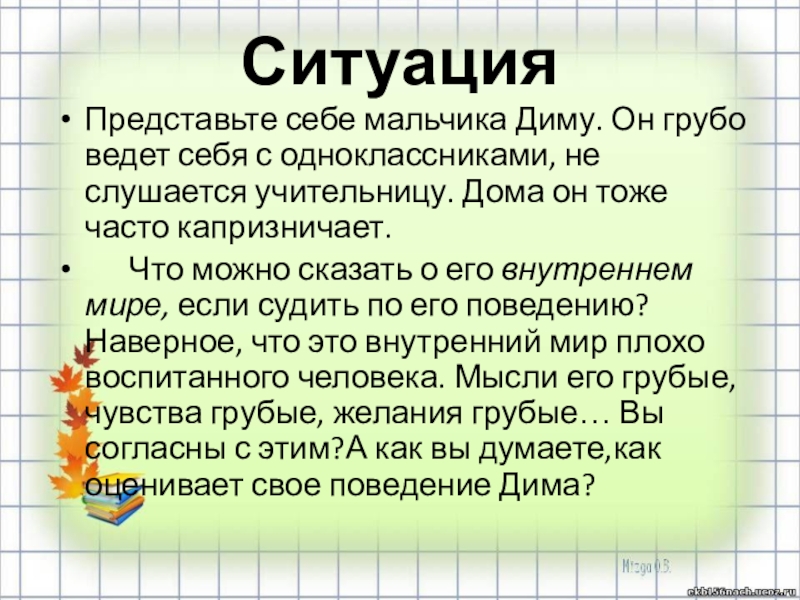 Что можно сказать о его внутреннем мире, если судить по его поведению? Наверное, что это внутренний мир плохо воспитанного человека. Мысли его грубые, чувства грубые, желания грубые… Вы согласны с этим?А как вы думаете,как оценивает свое поведение Дима?