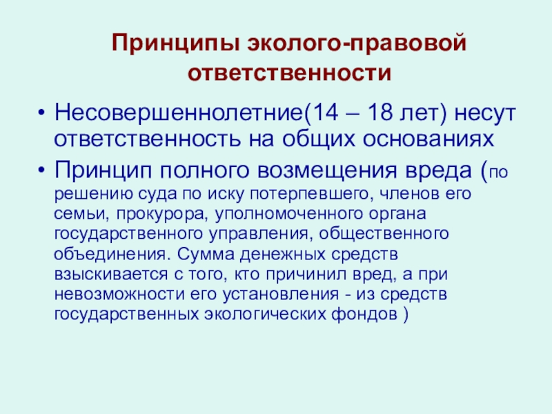 полного возмещения вреда (по решению суда по иску потерпевшего, членов его семьи, прокурора, уполномоченного органа государственного управления, общественного объединения. Сумма денежных средств взыскивается с того, кто причинил вред, а при невозможности его установления - из средств государственных экологических фондов )