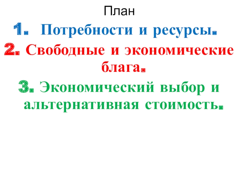 ПланПотребности и ресурсы.2. Свободные и экономические блага.3. Экономический выбор и альтернативная стоимость.