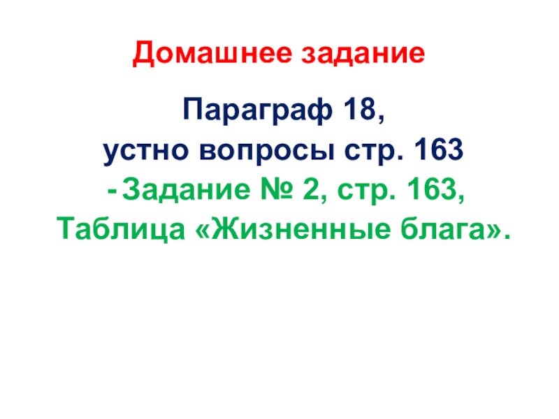 Домашнее заданиеПараграф 18, устно вопросы стр. 163Задание № 2, стр. 163, Таблица «Жизненные блага».