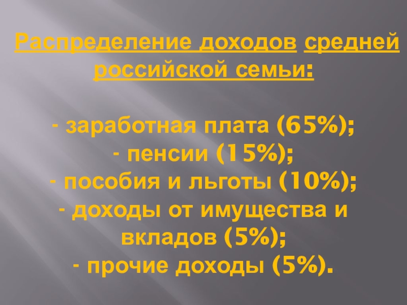 Распределение доходов средней российской семьи:  - заработная плата (65%); - пенсии (15%); - пособия и льготы