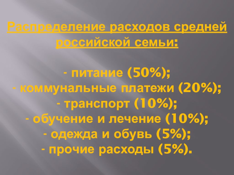 Слайд 23Распределение расходов средней российской семьи: - питание (50%); - коммунальные платежи (20%); - транспорт