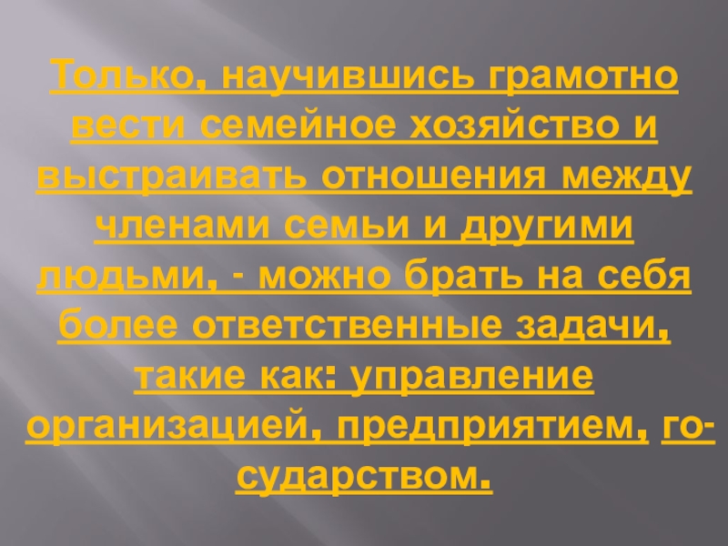 Слайд 30Только, научившись грамотно вести семейное хозяйство и выстраивать отношения между членами