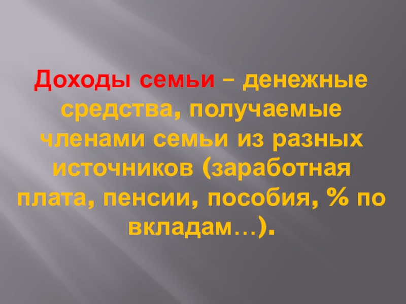 Доходы семьи – денежные средства, получаемые членами семьи из разных источников (заработная плата, пенсии, пособия, % по
