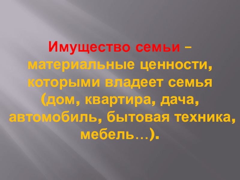 Слайд 13Имущество семьи – материальные ценности, которыми владеет семья (дом, квартира, дача,