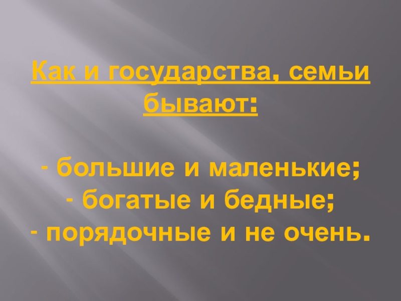 Как и государства, семьи бывают:  - большие и маленькие; - богатые и бедные; - порядочные и