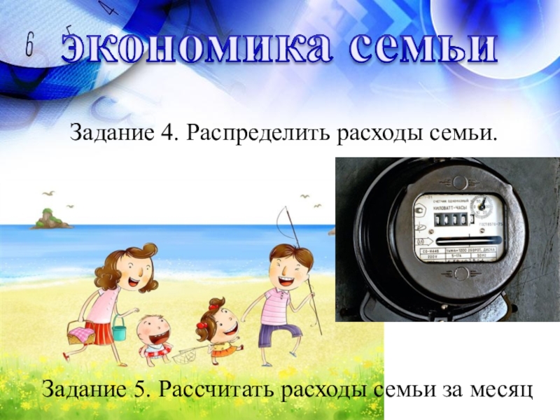 Задание 4. Распределить расходы семьи. Задание 5. Рассчитать расходы семьи за месяц