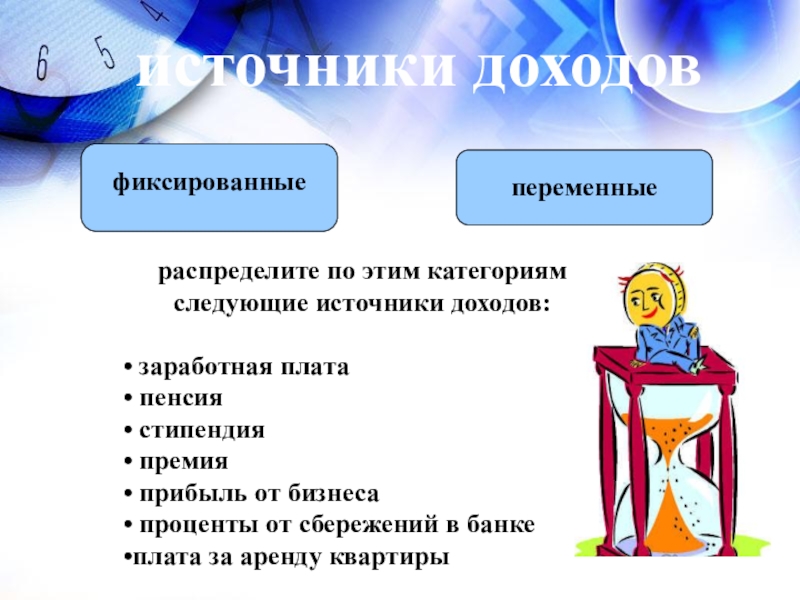 источники доходовфиксированныепеременныераспределите по этим категориям следующие источники доходов: заработная плата пенсия стипендия премия прибыль от бизнеса проценты