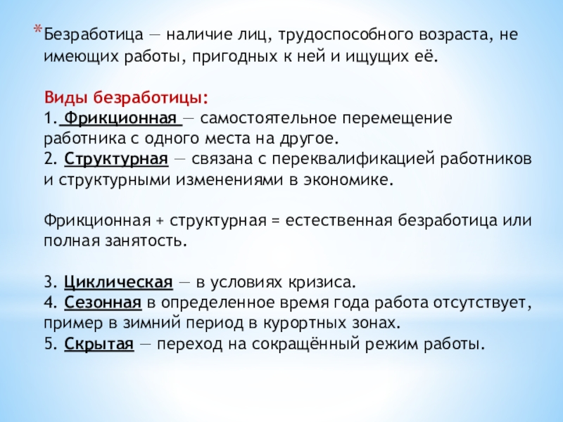 Слайд 14Безработица — наличие лиц, трудоспособного возраста, не имеющих работы, пригодных к