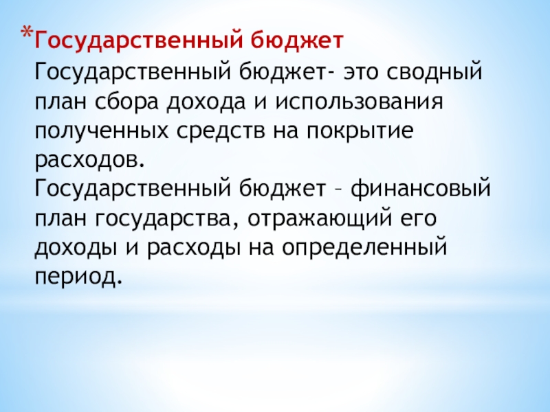 Государственный бюджет- это сводный план сбора дохода и использования полученных