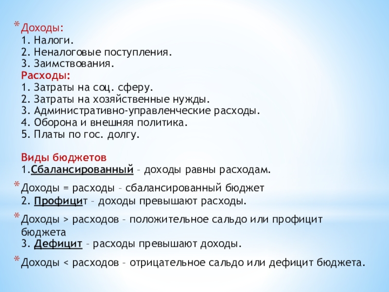 Доходы < расходов – отрицательное сальдо или дефицит бюджета.