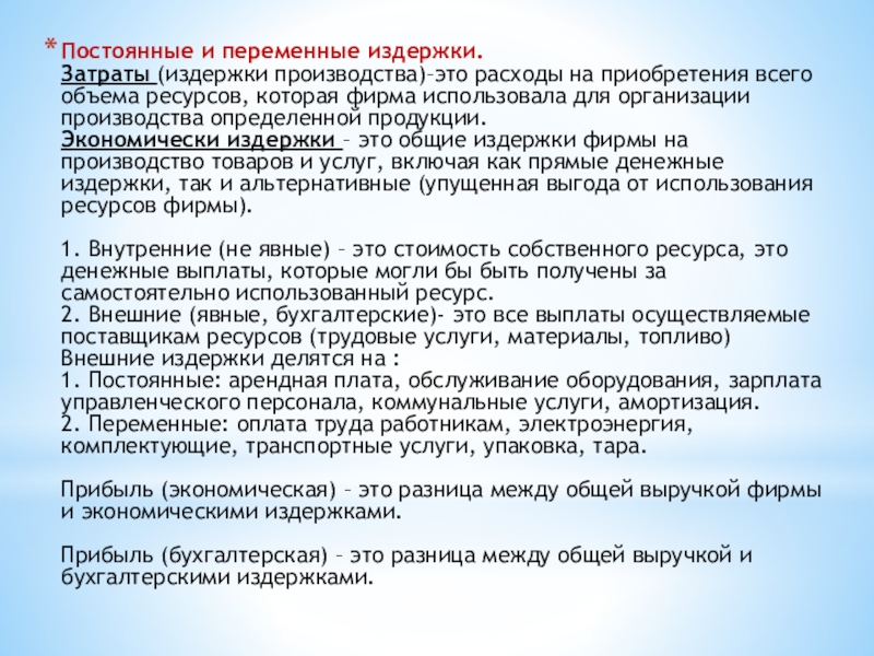 1. Внутренние (не явные) – это стоимость собственного ресурса, это денежные выплаты, которые могли бы быть получены за самостоятельно использованный ресурс.