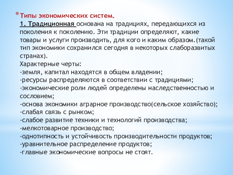 поколению. Эти традиции определяют, какие товары и услуги производить, для кого и каким образом.(такой тип экономики сохранился сегодня в некоторых слаборазвитых странах).