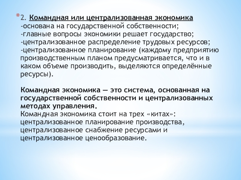 Командная экономика — это система, основанная на государственной собственности и централизованных методах управления.
