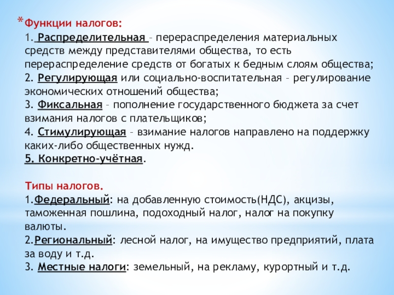 4. Стимулирующая – взимание налогов направлено на поддержку каких-либо общественных нужд.