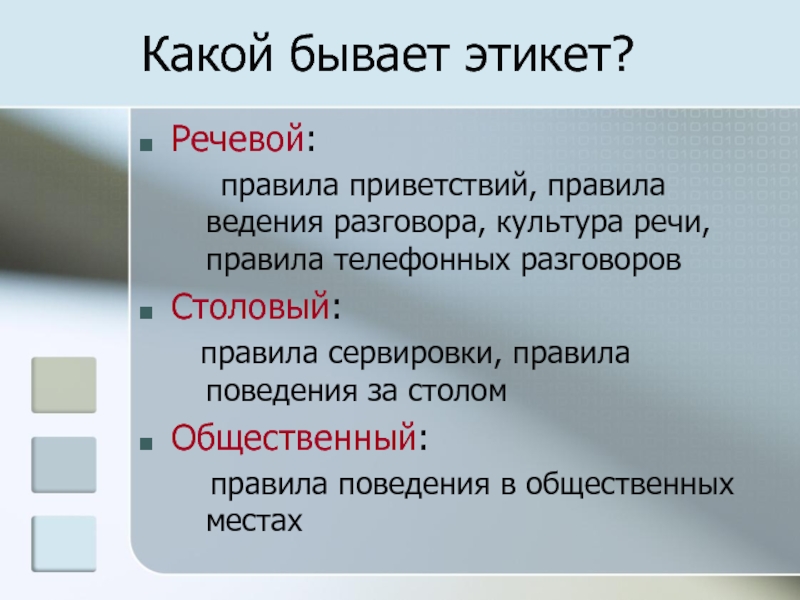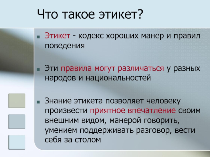 Знание этикета позволяет человеку произвести приятное впечатление своим внешним видом, манерой говорить, умением поддерживать разговор, вести себя за столом