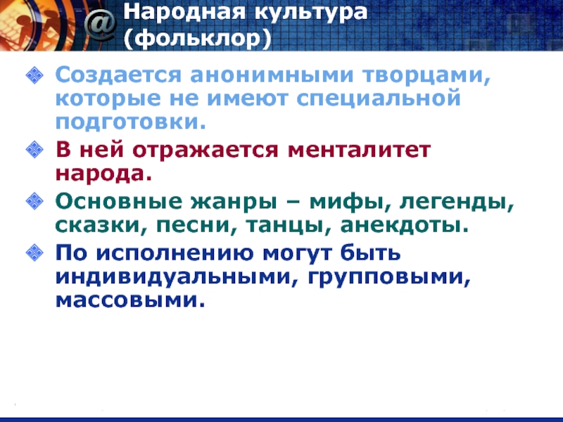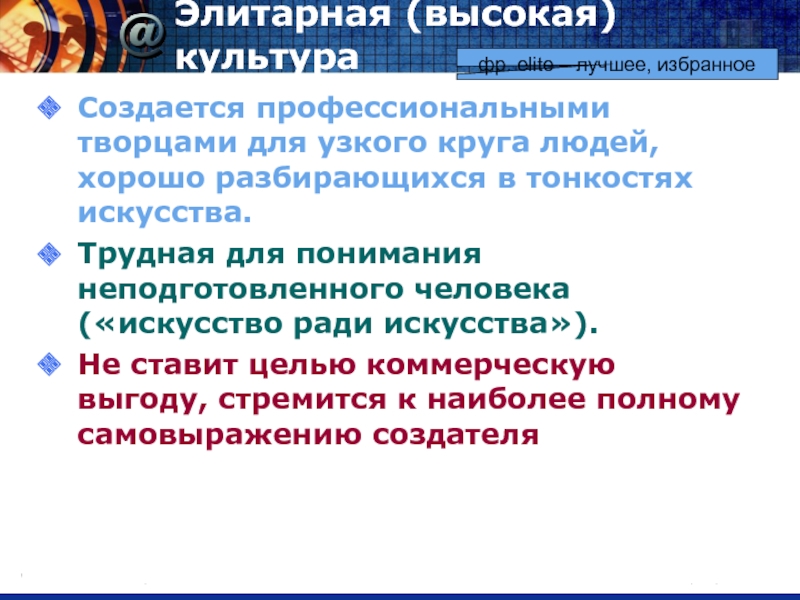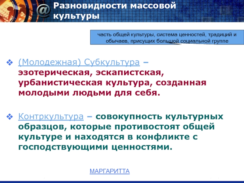 часть общей культуры, система ценностей, традиций и обычаев, присущих большой социальной группе