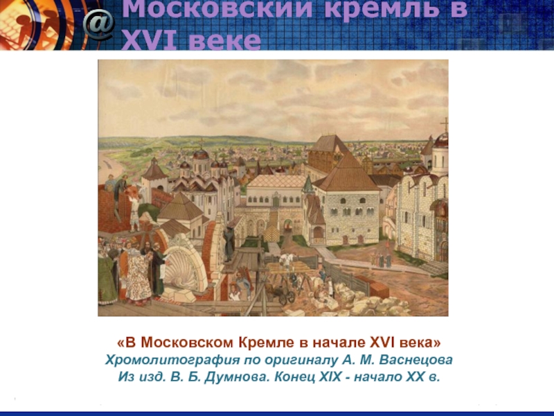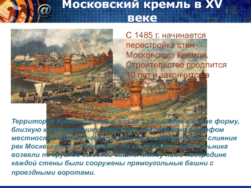 Территория Кремля охватывала 26,5 га и имела в плане форму, близкую к треугольнику. Это было обусловлено рельефом местности. Кремль располагался на высоком холме у слияния рек Москвы-реки и Неглинной. На каждом углу треугольника возвели по круглой высокой башне. Между ними посередине каждой стены были сооружены прямоугольные башни с проездными воротами.