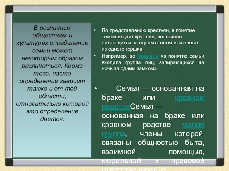 В различных обществах и культурах определение семьи может некоторым образом различаться. Кроме того, часто определение зависит также и от той области, относительно которой это определение даётся.
