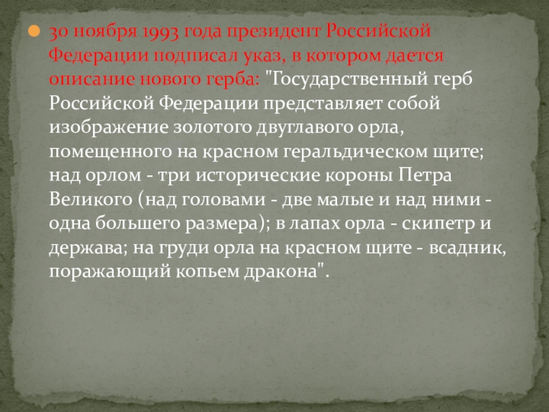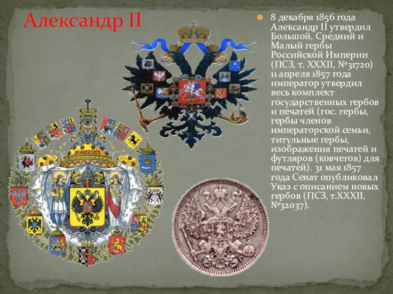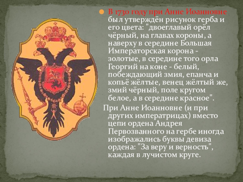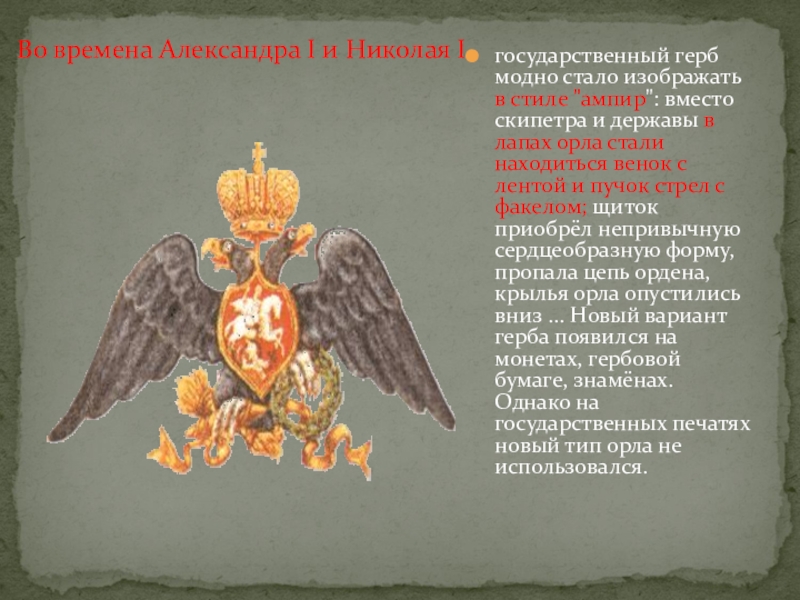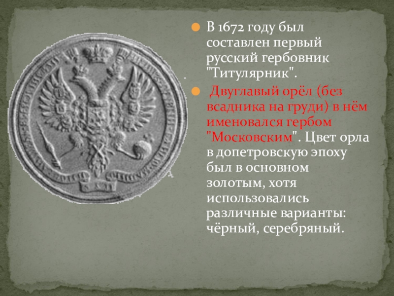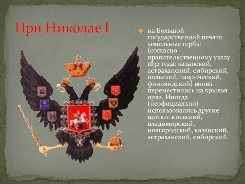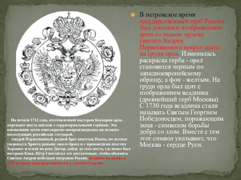 На печати 1712 года, изготовленной мастером Беккером орла окружают шесть щитков с территориальными гербами. Эта композиция затем многократно воспроизводилась на печатях последующих российских государей.