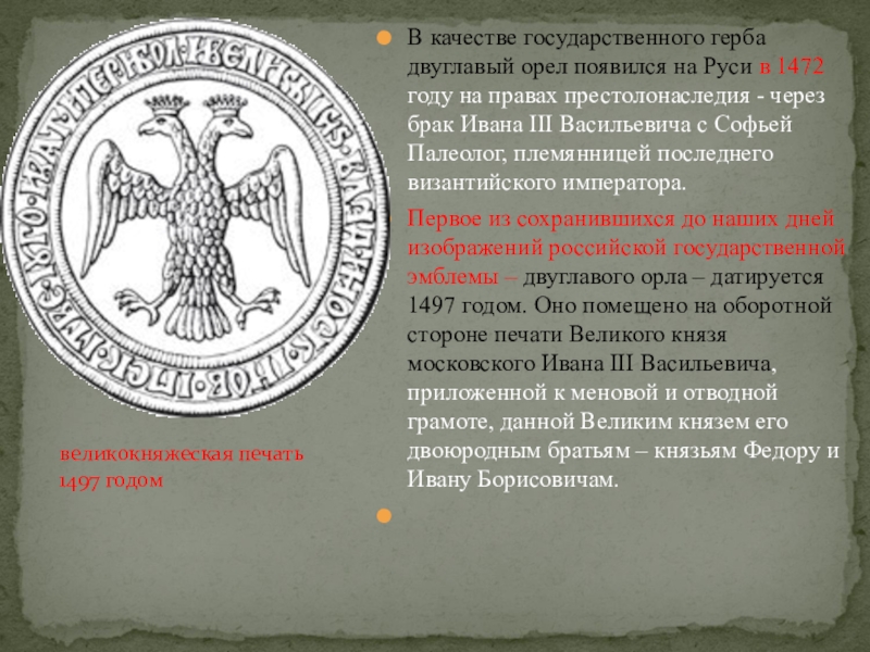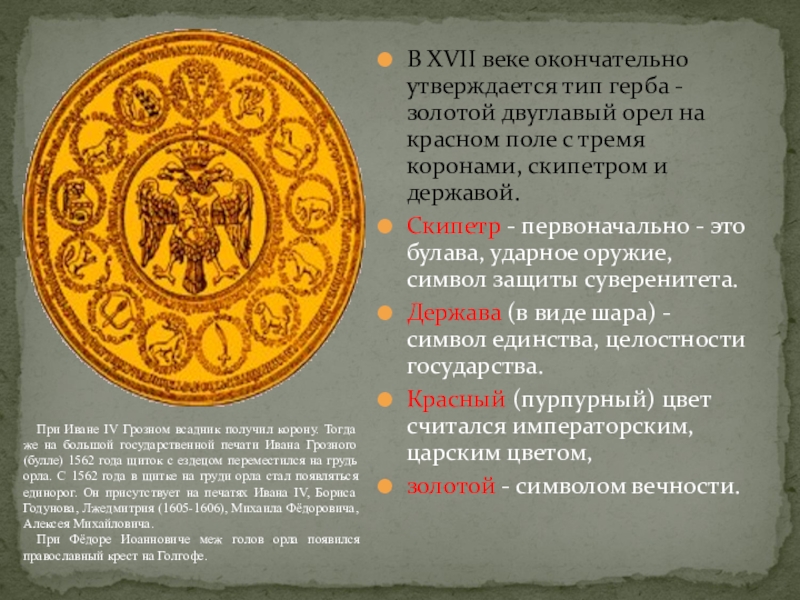 При Иване IV Грозном всадник получил корону. Тогда же на большой государственной печати Ивана Грозного (булле) 1562 года щиток с ездецом переместился на грудь орла. С 1562 года в щитке на груди орла стал появляться единорог. Он присутствует на печатях Ивана IV, Бориса Годунова, Лжедмитрия (1605-1606), Михаила Фёдоровича, Алексея Михайловича.