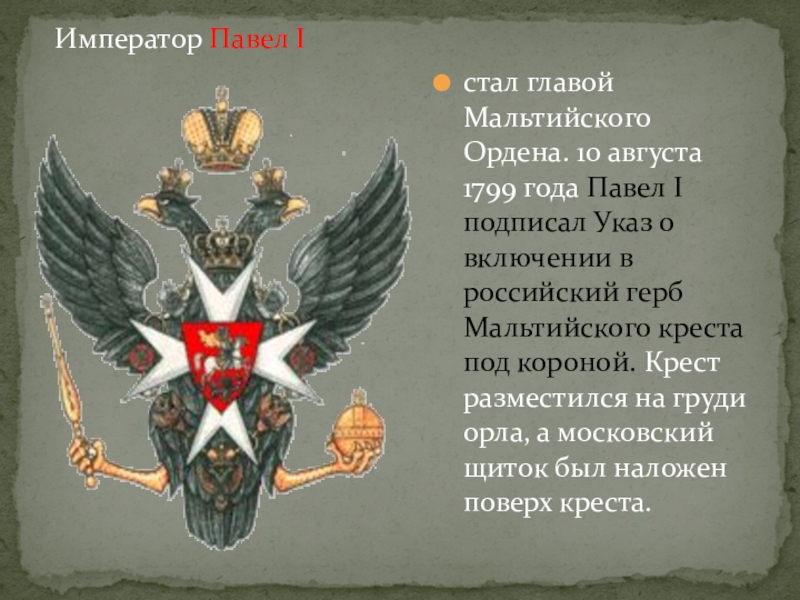 Андрей Первозванный, родной брат апостола Павла, по легенде уверовал в Христа раньше своего брата и с проповедями посетил Херсонес и земли по реке Днепр, дойдя до того места, где позже был построен Киев. Пётр I посчитал это достаточным, чтобы объявить Святого Андрея небесным патроном России. Всадник на щитке к 1710-м годам трансформировался в Святого Георгия
