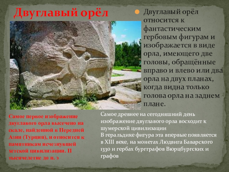 Самое первое изображение двуглавого орла высечено на скале, найденной в Передней Азии (Турция), и относится к памятникам исчезнувшей хетской цивилизации. II тысячелетие до н. э