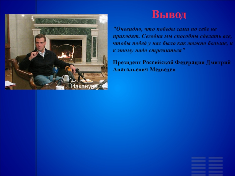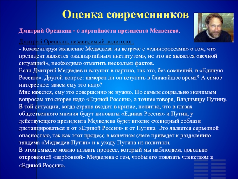 - При вступлении в должность Президента Российской Федерации Дмитрий Анатольевич Медведев обозначил тот политический идеал, которым намерен руководствоваться. Идеал — это высокая цель и бесконечная задача. Идеал — это тот путеводный свет, что ведет человека и государственного деятеля на протяжении всей его жизни. Можно спорить о путях достижения этого идеала, но, очевидно, что он не является ни наивным, ни утопическим. Уникальность личности Д.А.Медведева в том и состоит, что он способен консолидировать людей разных убеждений, разных взглядов, разных политических пристрастий в рамках той программы действий, которую исповедует.