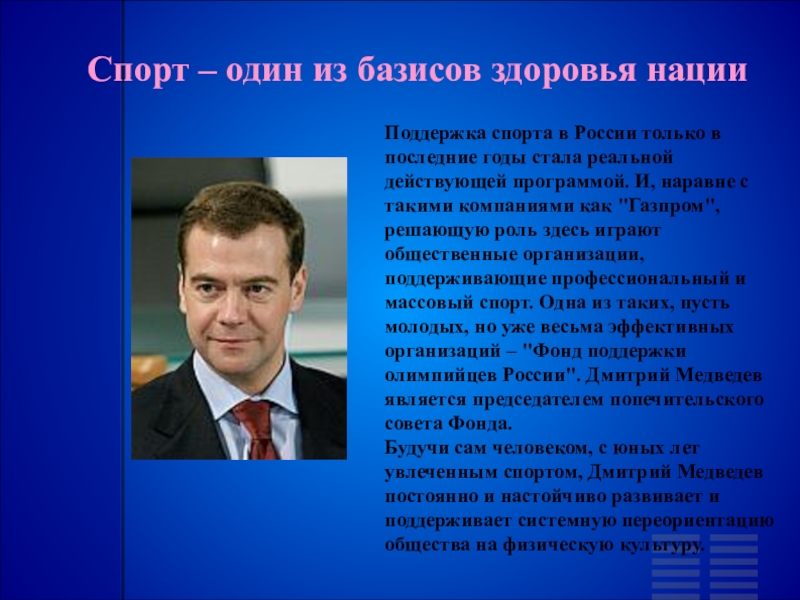 в последние годы стала реальной действующей программой. И, наравне с такими компаниями как "Газпром", решающую роль здесь играют общественные организации, поддерживающие профессиональный и массовый спорт. Одна из таких, пусть молодых, но уже весьма эффективных организаций – "Фонд поддержки олимпийцев России". Дмитрий Медведев является председателем попечительского совета Фонда.