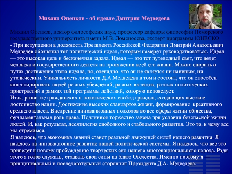 Слайд 16Михаил Опенков - об идеале Дмитрия Медведева