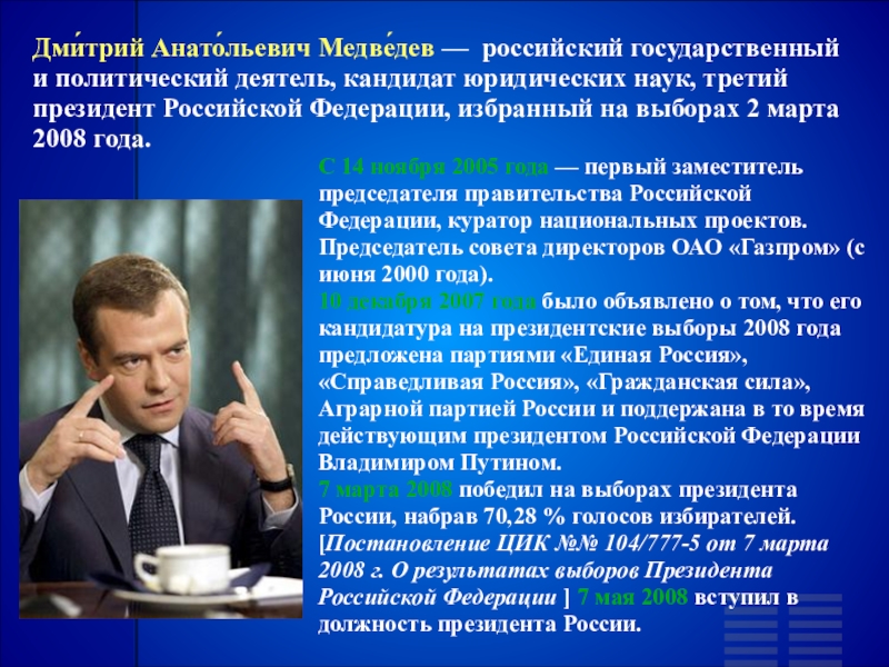 Дми́трий Анато́льевич Медве́дев — российский государственный и политический деятель, кандидат юридических наук, третий президент Российской Федерации, избранный на выборах 2 марта 2008 года.